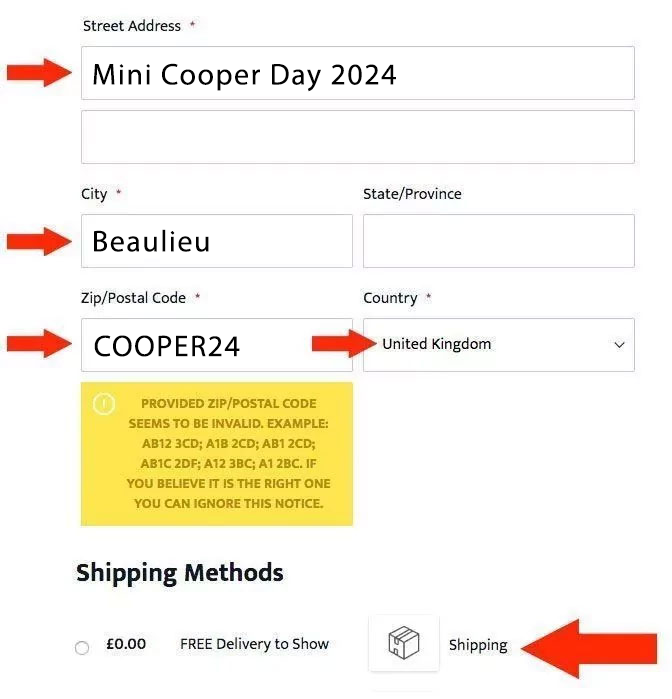 Step 4: Select FREE DELIVERY (Please ignore the notice in the yellow box which will appear once you have entered COOPER24 in the Post Code box)