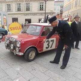 The first day of filming wasn’t as intense as the days that followed, allowing people to get used to everything. The scenes shot included the part where the Mini trails behind the Mercedes, Ford Falcon and Saab on the bridge, and the start in Reims where the young lady in period clothing describes the Mini as a “sweet little tin can, or a “toy” depending on which version you see! These were actually filmed in Nice, and involved the cast and extras wearing period winter dress in the searing summer heat.
